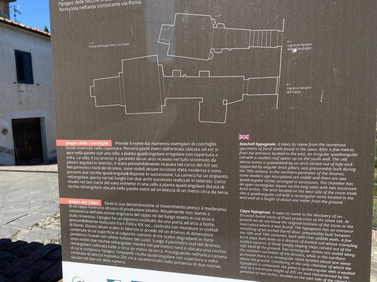 Terricciola nekem nagy meglepetés volt az etruszk eredetű barlangok miatt....- A város egy ősi, etruszk eredetű, dombtetőn fekvő falu Pisa megyében, melyet a szőlőtermesztéshez ideális termékeny talajának köszönhetően a „Bor városaként” is ismernek. A Pisai-dombsági ( strada del vino di colline pisane) borút tagja. Festői középkori utcákat, csodálatos kilátást valamint fontos gasztronómiai és borászati eseményeket tartanak itt, mint például a Szőlőfesztivál, a Notte Bianca del Vino (a bor fehér éjszakája) és a „Calici di Stelle” ( Csillagok pohara), valamint olyan érdekes helyeket, mint a Villa Gherardi del Testa és a Belvedere Hypogeum.