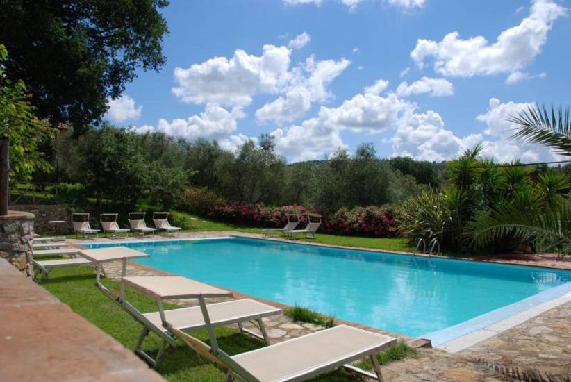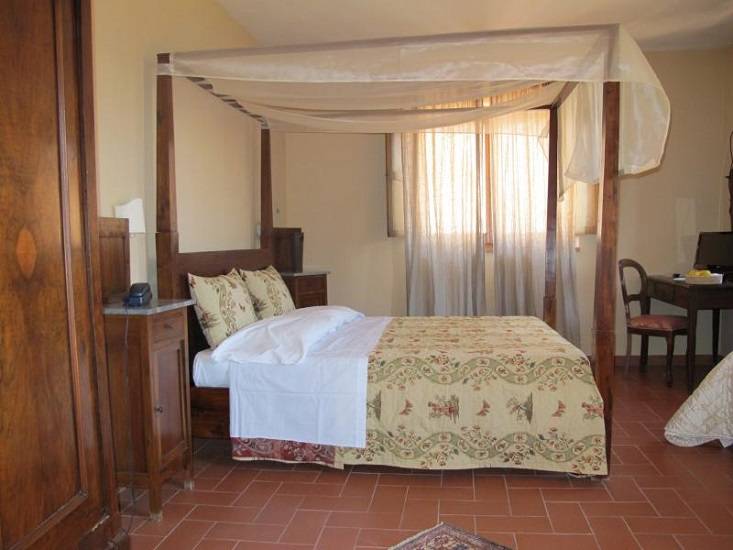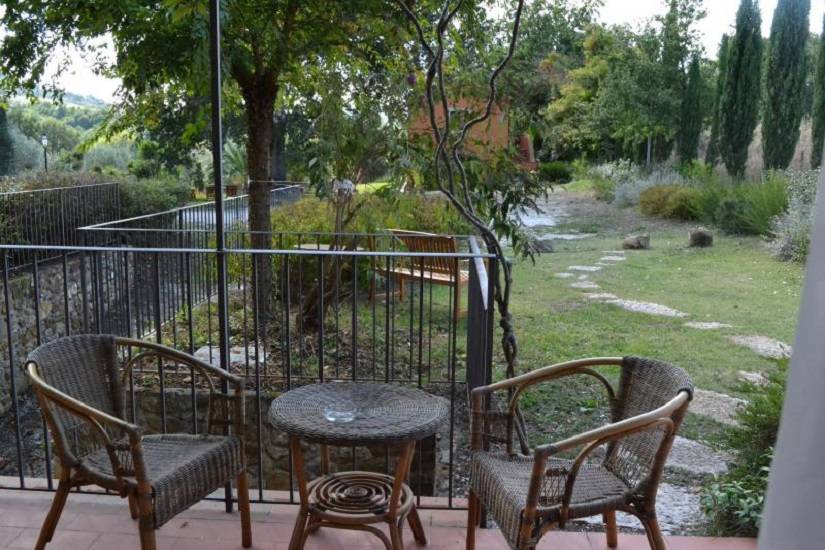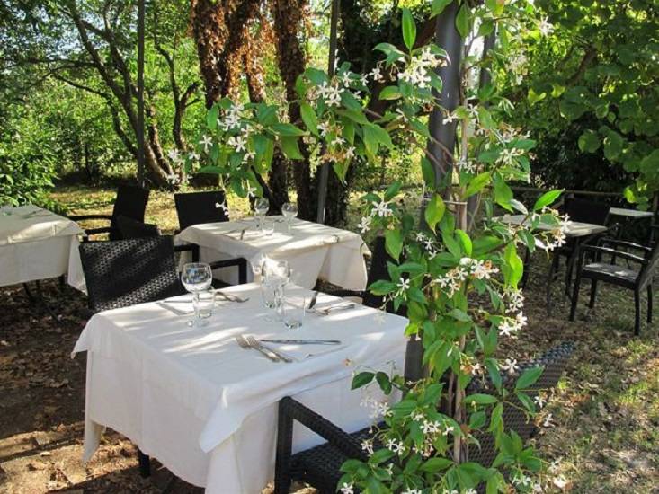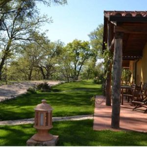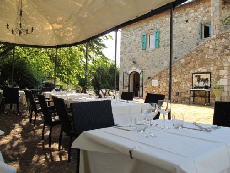 Étterem: a kertben egy ciprusokkal szegélyezett utacska vezet egy másik kőépületben található étteremhez, kinti asztalokkal az árnyas teraszon. A berendezés rusztikus és igényes és híresek bio alapanyagaikról viszont árai ennek megfelelően magasak - inkább ínyenceknek ajánlom. Büszkék arra hogy a legtöbb alapanyagot helyben saját vagy környező termelőktől szerzik be tehát 0 kmről. Mellette egy kereszt alakú kőépület van nagy üvegablakokkal -itt egy kis wellness részleg ahol most egy új medence is van. A parkban több száz éves tölgyek is vannak, kaktuszok és persze az elmaradhatatlan ceruza-formájú ciprusok. Egy nagyobb elkerített részen 3 lovat is láttunk, gyönyörű fekete fényes szőrű kecses ló melyeket a Pisa melletti San Rossore parkból hozták de alapvetően vadlovak tehát nem lehet meglovagolni őket.