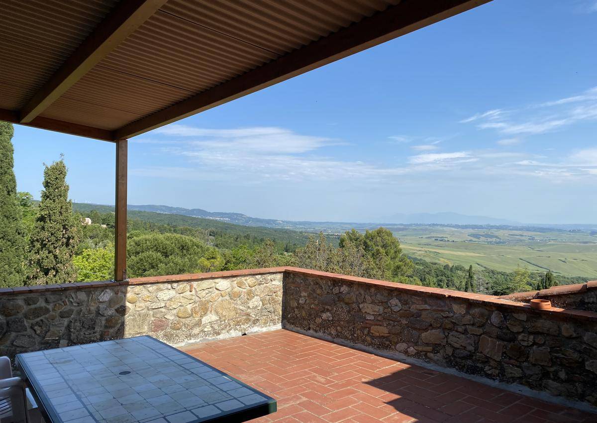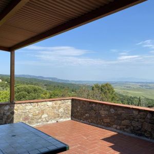 A nagyobb apartman vagyis Terrazza 4 hálószobás de igazán csak 2 szobát szoktunk használni, így 4 felnőttnek ideális vagy egy párnak több gyerekkel. Felérve a lépcsőn a nagy nappaliban találjuk magunkat a fagerendás tetővel, kandalóval fotelekkel. Ha a lépcsőfeljárótól belépünk a nappaliba rögtön balra van az ajtó a teraszra ahonnan fantasztikus a kilátás Lajatico felé de egészen Pisáig. A nap és szél ellen most a teraszon fix tető van mert a napernyőket rángatta a szél. Van persze egy kinti asztal, napszékek és kemence ( grillezéshez), teregetni is lehet.