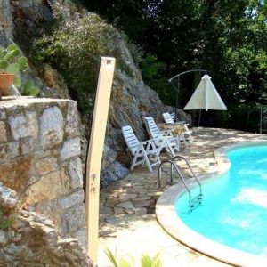 kert: mediterrán növényekkel, virágokkal és fűszernövényekkel beültetett kert kinti asztalokkal, grillel. A medence különleges szappanalakú 9x 5 méteres, vannak napágyak, kinti zuhany, a terasz oldalsó falában egy fatüzeléses kemence pizza- és kenyérsütéshez. A kapun belül leeht megállni az autókkal.