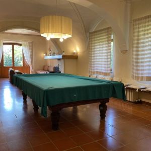 A 330 m2 alapterületű épületben alul vannak a közös helységek mint nappali, étkező és konyha és fent vannak a hálószobák fürdőszobákkal. Az alsó szinten több bejárat is van, az egyik a medence felőli oldalon lévő nagy üveges ajtó, oldalt a fedett teraszról van a másik bejárat. Az üveges ajtón keresztül belépve egy hosszú boltíves hallba jutunk amiben egy kandalos kisebb nappali rész után a billiárdasztal majd egy hosszú étkezőasztal van és a végén egy rusztikus konyha üvegfallal elválasztva. Jobbra mellette van egy nagobb nappali körben a fal mellett az ablakok alatt U alakban pad párnákkal. Hátul található a rusztikus de felújított konyha mosogatógéppel, mikroval, hűtővel és előtte egy nagy fa étkezőasztallal ahol akár 15-en is együtt tudnak enni. A felső szinten 5 gyönyörűen berendezett szoba található parkettel és antik bútorokkal és 4 fürdőszoba. Az épületben vannak egyéb helységek is mint a mosókonyha mosógéppel vagy egy raktár és és egy vadászoknak fentartott szoba meg egy boros pince is, ez utobbiakat a vendégek nem használhatják. Természetesen mindegyik szobában van Tv is külföldi adókkal és lent DVD, CD lejátszó is.