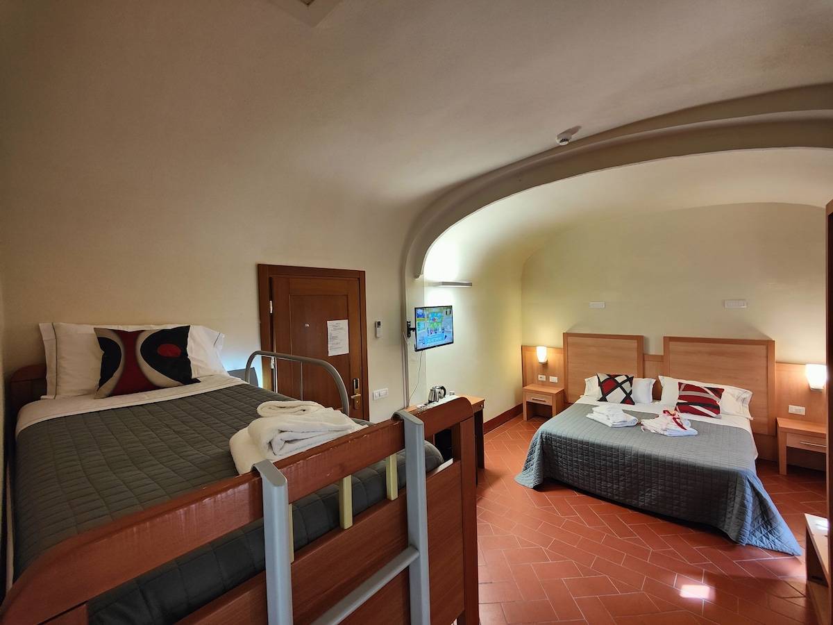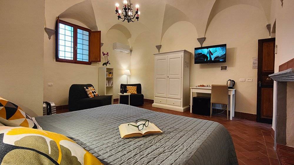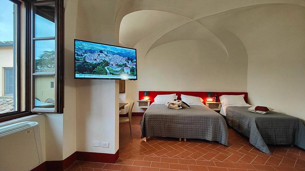 A kolostort először kb 20 éve láttam amikor egy csoportnak kerestem szállást és aztán szinte el is felejtettem míg egy pár éve újra belefutottam és kellemesen meglepődtem hiszen teljesen felújították. Több belső udvara van ahol régen a szerzetesek kiskertben zöldséget és gyümölcsöt termeltek, ma vacsorára vannak terítve az asztalok... a szerzetesek hátsó kertjében most napozni és fürödni is lehet .... de ne szaladjunk előre. Maradtak hostelszobák is amikben 4/ 6-an is elférnek az emeletes ágyakon és a fiatal utazók kedvelt, költségkímélő megoldása. Az épületegyüttes egyik részében standard szobák vannak pároknak és nagyobbak is 3/4 fős családoknak, egy másik folyosón pedig szuperior szobákat találunk új berendezéssel. A régi freskós teremben ahol a szerzetesek ettek ma a vendégek reggeliznek bár kint a loggiás részen is vannak asztalok, de itt inkább vacsorára szoktak teríteni.