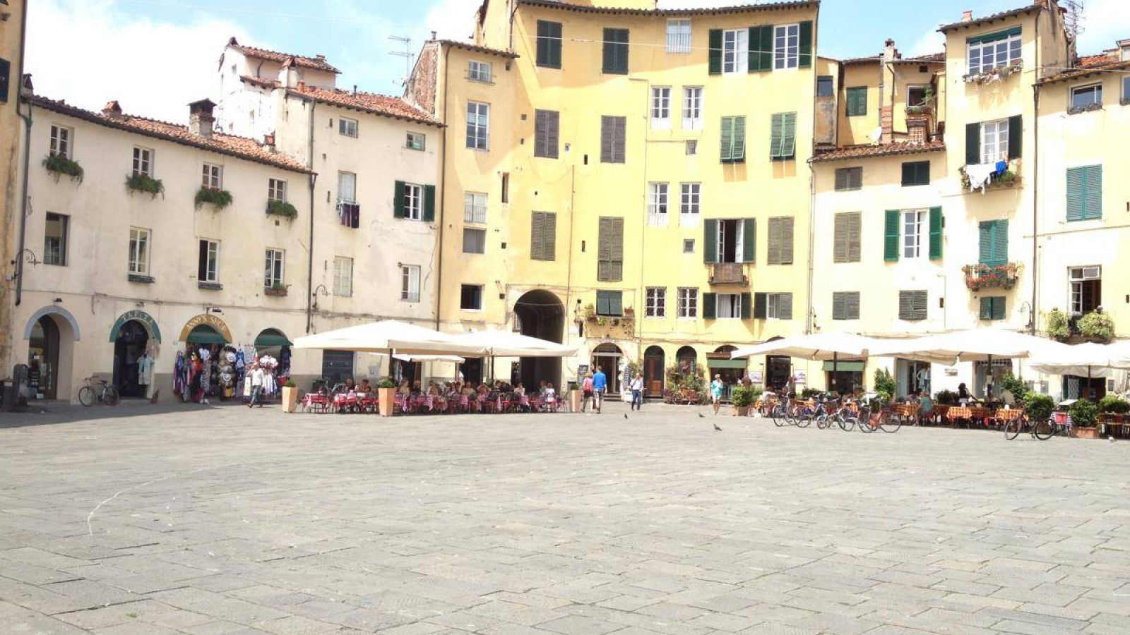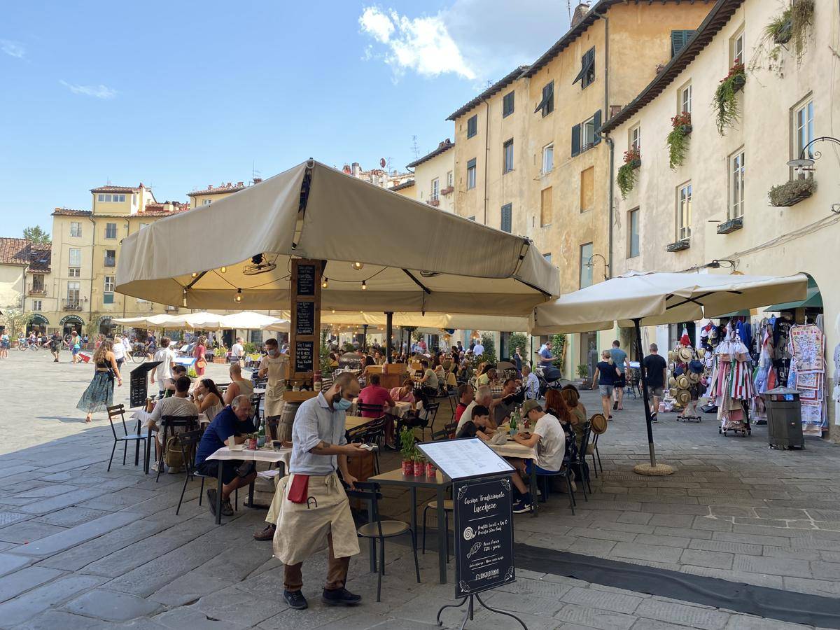 Luccát a római hatalom biztositására alapították i.e. 180-ban (!!) és erre az időre utal a város szimbóluma is, az ovális Piactér- ma Piazza Anfiteatro, mely az ókorban anfiteatrum vagyis színház volt. Nagyságát úgy becsülik, hogy kb. 54 boltive volt, és 10.000 néző befogadására volt alkalmas. Ebből persze nem maradt meg semmi, köveit széthordták a különböző korokban, eredeti kövezete kb. 2 m mélyen van. Ha kimentek a térről a házak hátsó oldalán még látható az ókori római colosseum fala és boltjvei beépítve a házakba, és megmaradt a 4 bejárata, melyen át a gladiátorok közlekedtek. Ma egy nyüzsgő tér ez éttermekkel, borozókkal, boltokkal ahol nyáron napernyők alatt este gyertyefénynél lehet enni- inni.