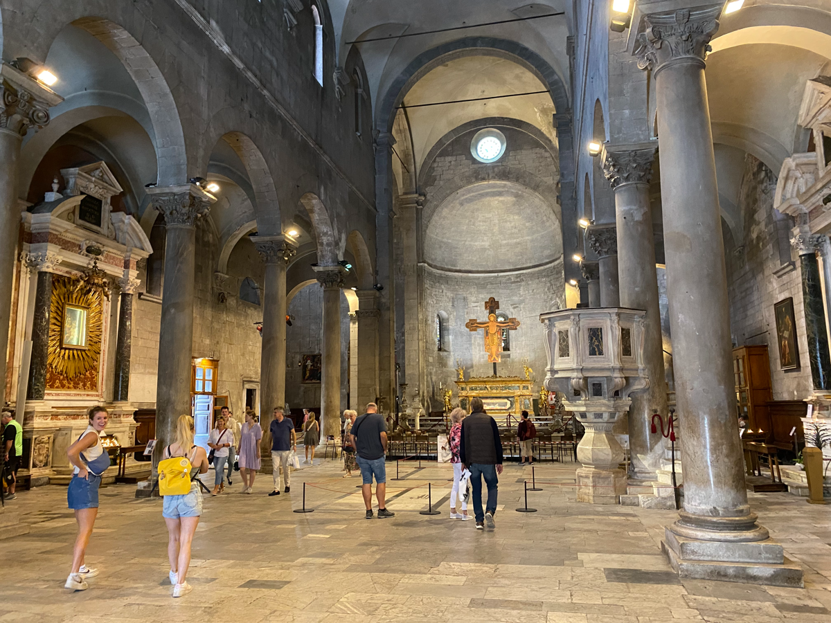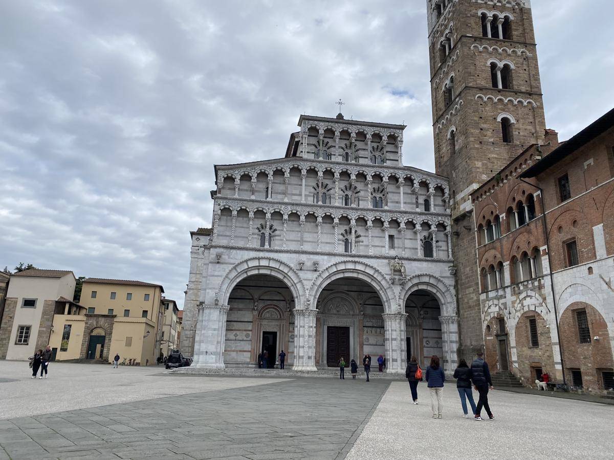 Rengeteg templom van Luccában, állítólag 100. A Dom, azaz a luccai-római stílusú San Martino templomot 1070-ben szentelte fel a pápa de még 600 évig épült. Homlokzata asszimetrikus, mert jobbra helyet biztosit a campanillének vagyis az óratoronynak is. A három boltív alatt jobbra pompás domborművet láthattok Szent Regulus vértanúságával, a hónapok ciklusait és Szent Márton történeteivel. A különböző hónapok megformázása rózsaszín és fehér márványból. pl. január tüzet gyújt, február halászik... de többnyire a mezőgazdasági munkákat mutatja. Míg a bal oldali hajó bejáratánál lévő lunettában nézzétek meg Nicola Pisano 1260-ból származó kivételes domborművét mely Krisztus keresztről levételét ábrázolja.