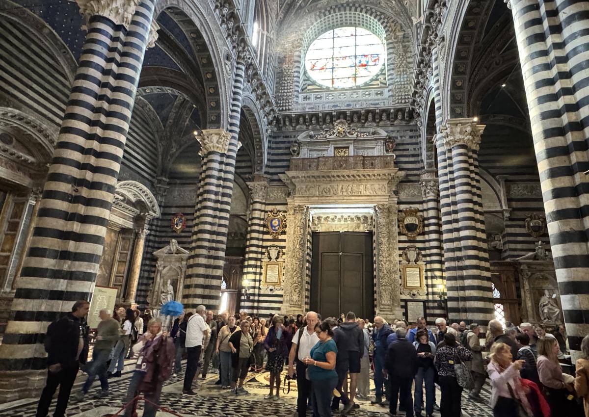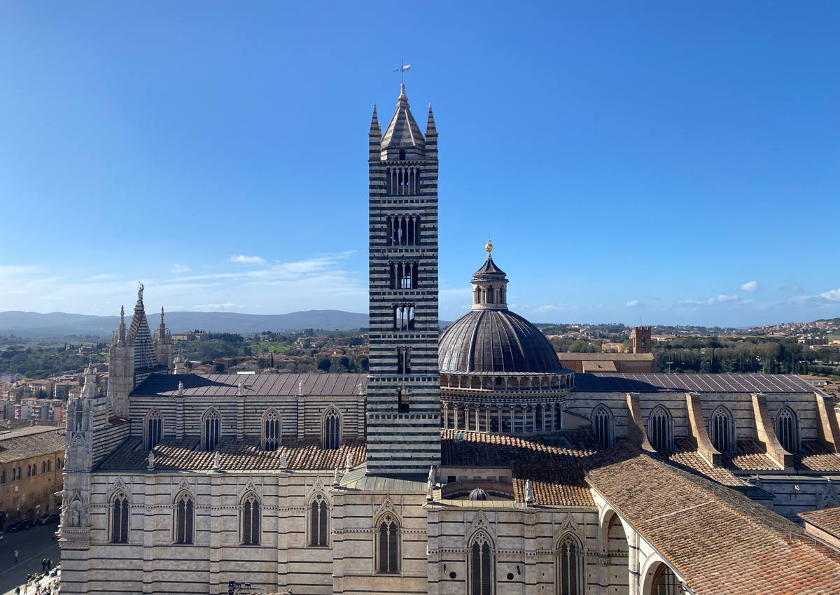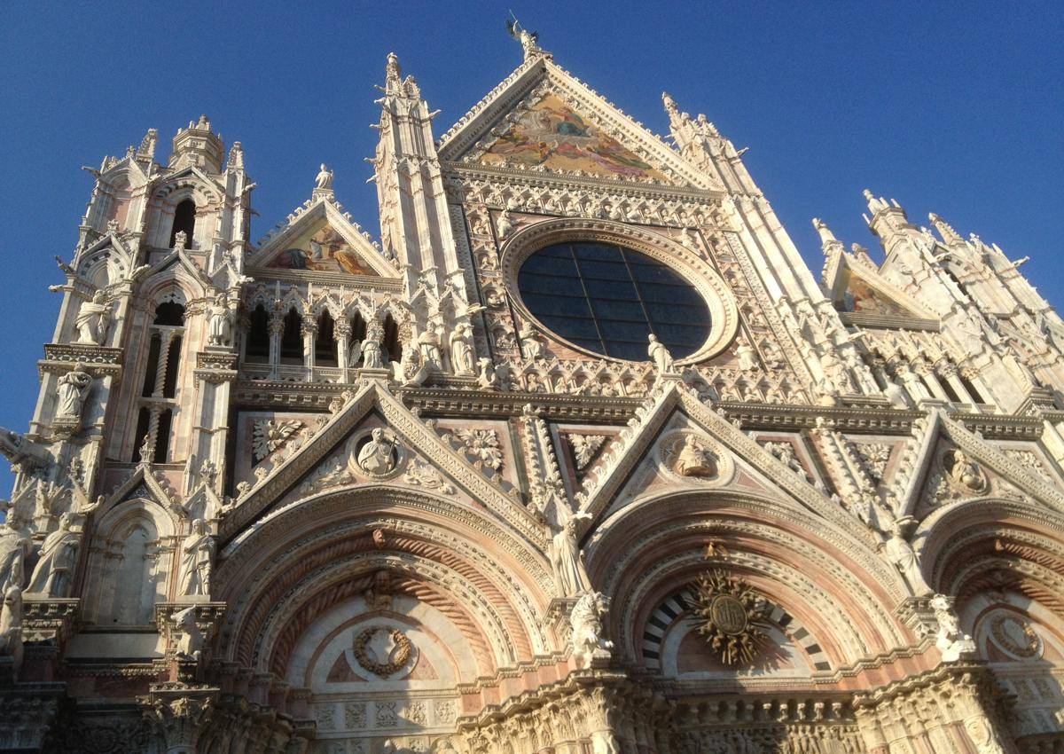Siena három dombtetőre épült egy városfalon belül, és harmadokból, illetve 17 részből áll. Mindenhol feltűnnek a város jelképei: az állatok, köztük a farkas, mert a legenda szerint a Rómából ismert Remus fia alapította. Az utcákon láthatjuk egymás mellett a XII -XIV. századi gyönyörű palazzokat, a bankokat, melyek a középkorban a francia és angol királyoknak adtak titkos kölcsönöket. Mintha megállt volna az élet ezekben a századokban, és részben így is van. Először 1348-ban, a pestisjárványban a város lakosságának egyharmada meghalt, ami a Dóm tovább építését is megakadályozta. Majd 200 év múlva a firenzeiekkel vívott harcok után vesztesként minden fejlesztést, építkezést is megtiltott a győztes Firenze.