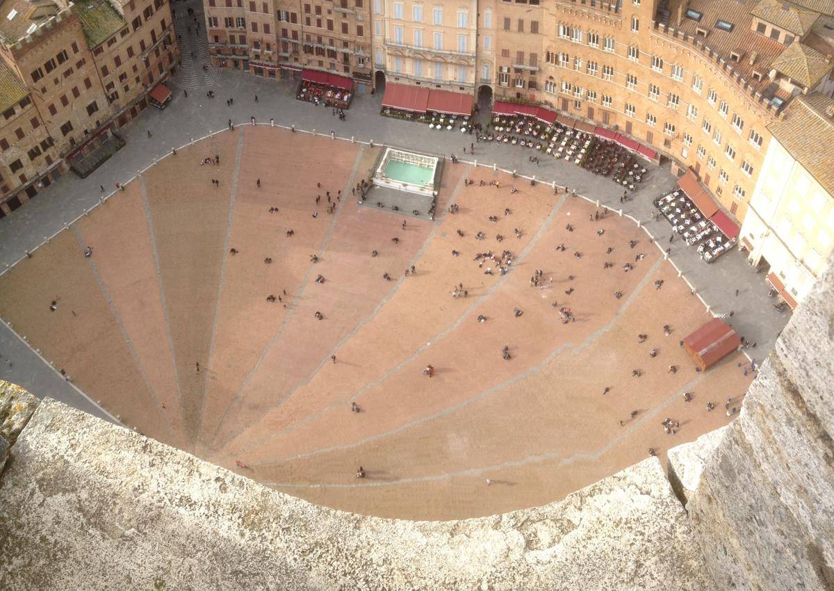 A város 'szíve' a Piazza del Campo, a legyezőalakú tér, melyen a híres Palio nevű lovasjáték ( lásd a programajánlóban) is folyik. Itt áll a Palazzo Publico és sok más impozáns régi palazzo is. A világ egyik legszebb tere a XII. században épült és felülmúlhatatlan harmóniát sugároz. A tér burkolata 9 gerezdre van felosztva, ami a városi tanácsot, az úgynevezett Kilencek Tanácsát szimbolizálja. A tér a Palazzo Pubblico felé lejt, vörös téglával van borítva, és szinte minden napszakban turisták heverésznek rajta. Középen egy négyzet alakú kút található az 133as évekből mely a vízellátást biztosította (forrásvízet vezettek ide), ez a Fonte Gaia, . Érdemes leülni egy kicsit a térre és körbenézni a palazzok során, mert mindegyik nagyon régi és önmagukban is remekművek - köztük a Palazzo Piccolomini és a Loggia della Mercanzia. Mindenképpen meg kell nézni a Dómot, amely kívül és belül is fantasztikus.