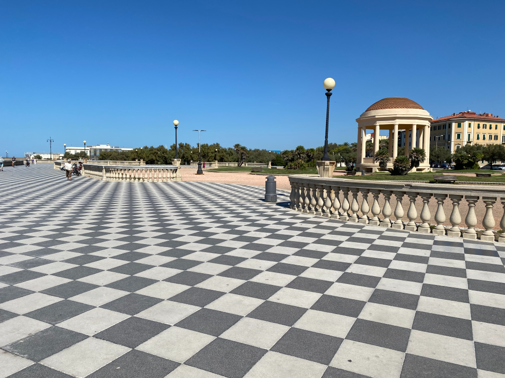 Terrazza Mascagni A terasz mai helyén eredetileg egy tornyokkal, vastag falakkal ellátott igazi erőd állt melynek neve Forte dei Cavalleggeri. Ezt a tornyokkal együtt lebontották és széthordták a helyiek Olaszország egyesülésekor (1872-ben) aztán egy park majd a híres terasz lett a helyén, ez utóbbi csak 1925ben készült el. Fotósoknak igazi ínyencség szerintem a fekete-fehér mintás burkolat és impozáns mérete miatt főleg ha még a nap is süt. Most is rengetegen sétálnak rajta akár gyerekekkel, akár gyalog de rendeznek itt koncerteket is, viszont a tengerbe nem leeht bemenni és sziklás is.