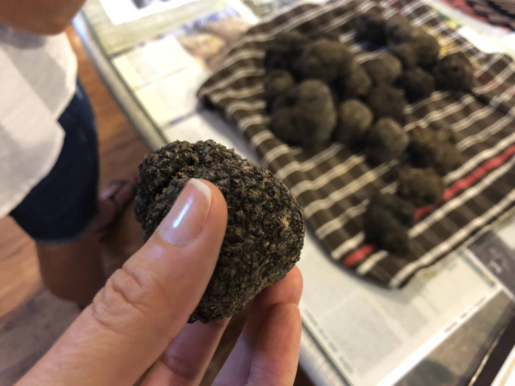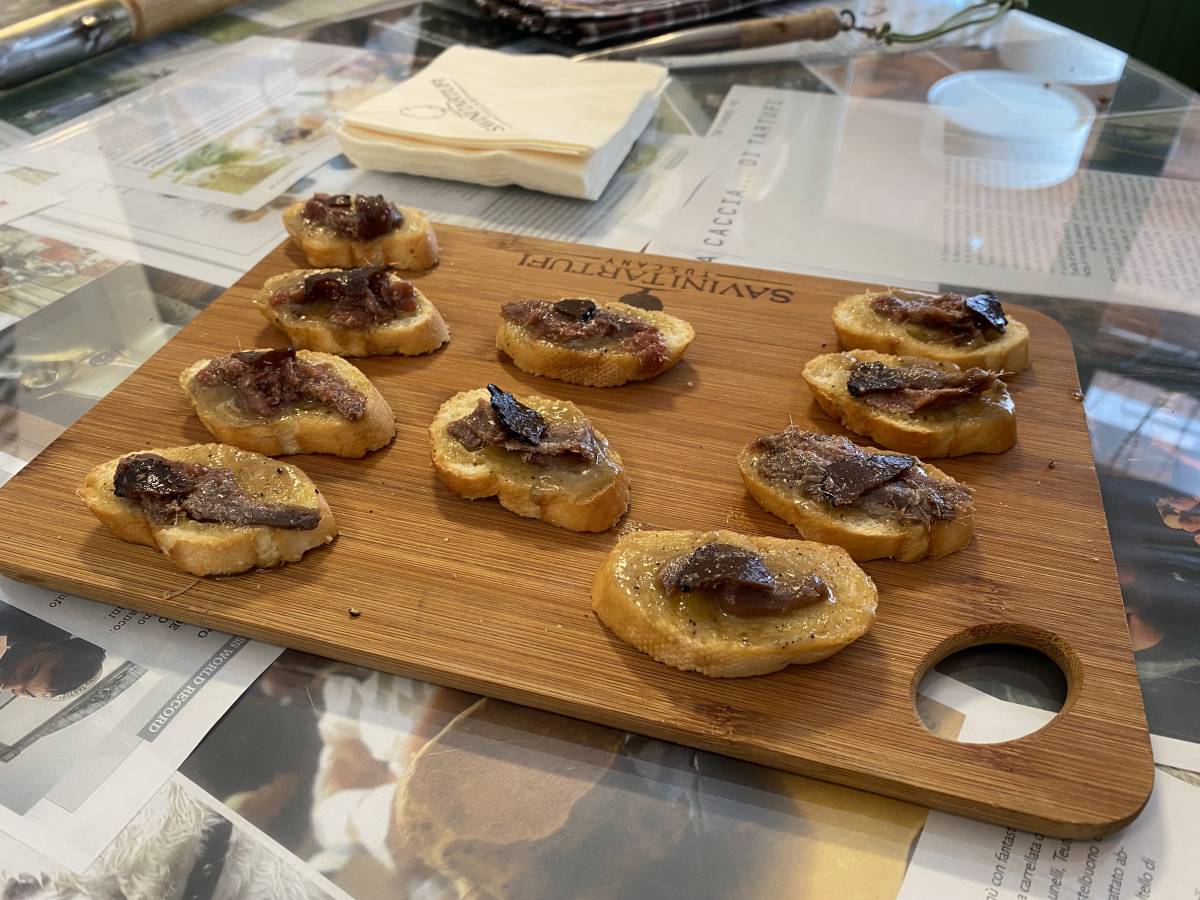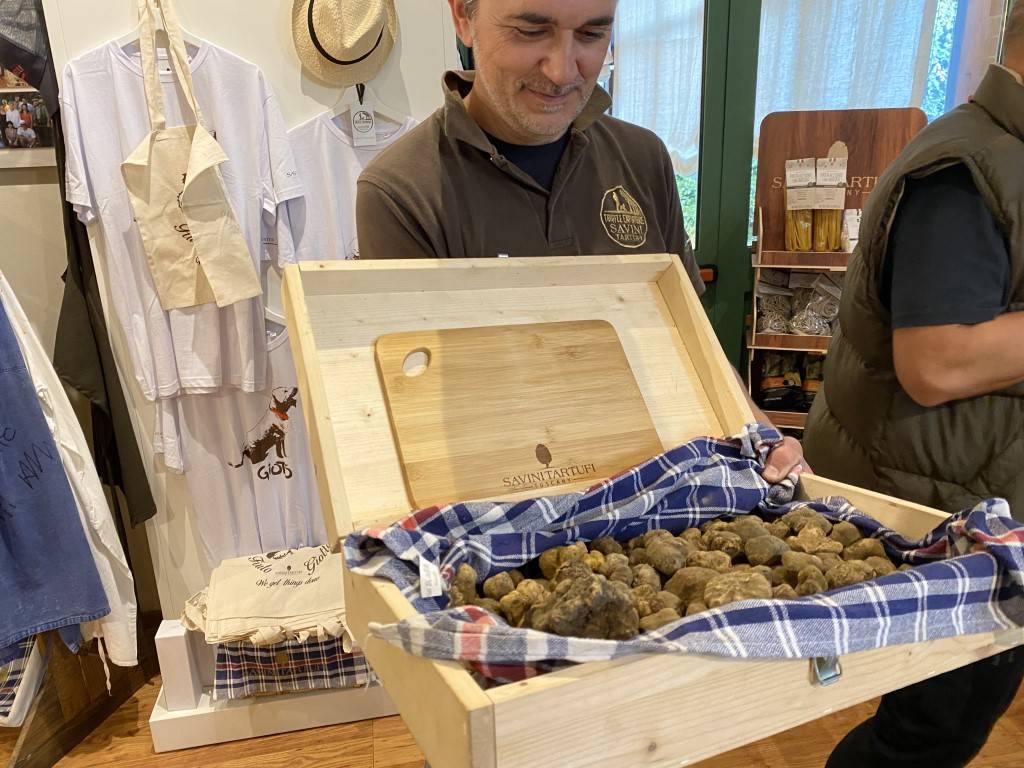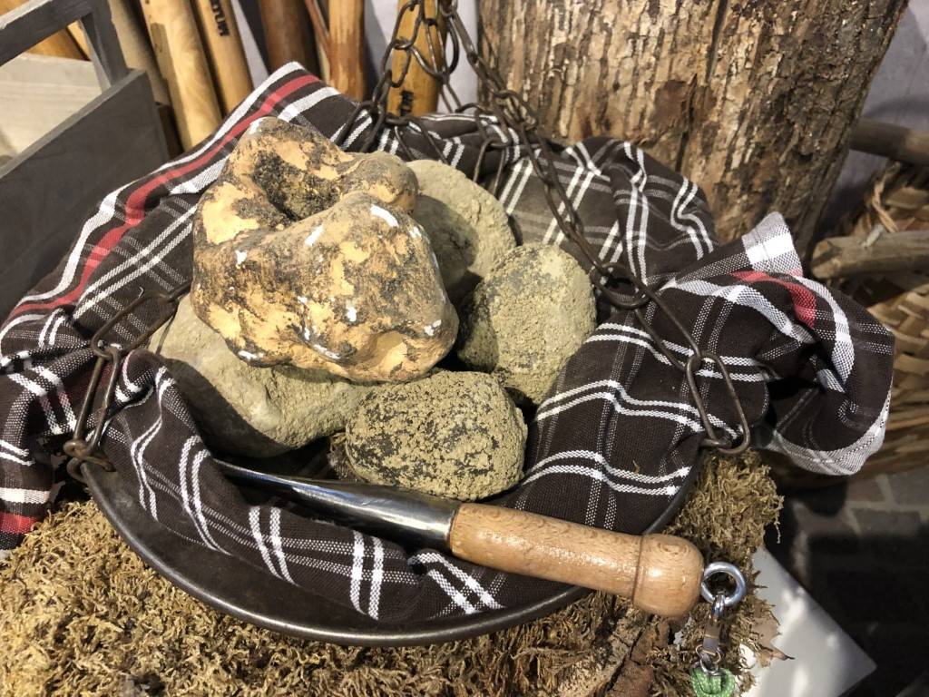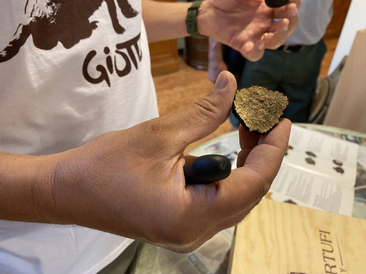 A szarvasgomba vagyis tartuffo ezen a toszkán részen is megtalálható, a legdrágább fehér változatot novemberben innen San Miniatoig találjuk. Megnézzük és elmondják milyen fajtái vannak, melyik mikor érik és hogyan keresték ezeket régen malacokkal illetve ma főleg idomított kutyákkal. Aranyárban mérik nem véletlenül hiszen termeszteni nem nagyon lehet ( bár próbálkoznak) és csak több feltéttel egybeesése esetén születnek meg a fák gyökerei között. Kezünkbe is vehetjük a reggeli behozott termést és meg is kostolunk belőlük egy picit többféle formában feldolgozva egy pohár prosecco vagy bor mellett. A végén még a profi kereső kutyákat is megnézhetjük és meg is simogathatjuk.