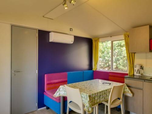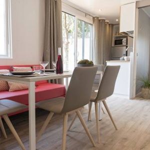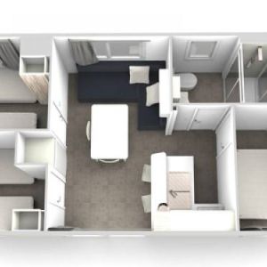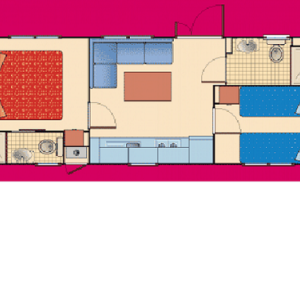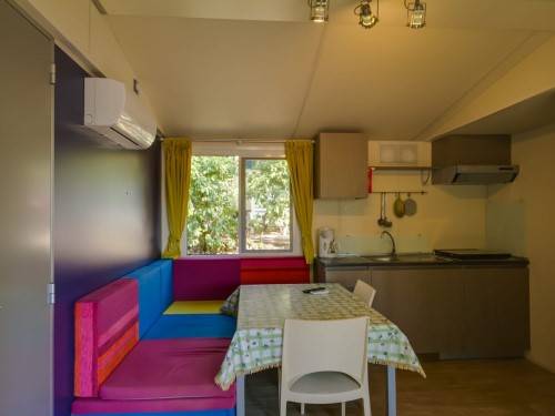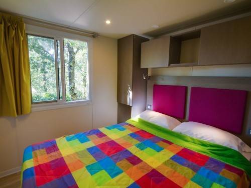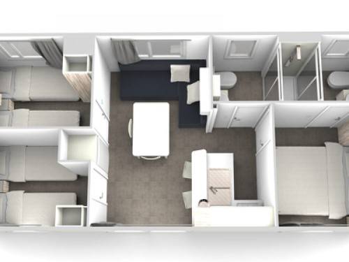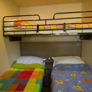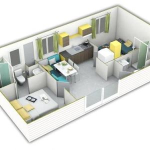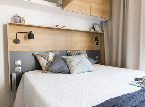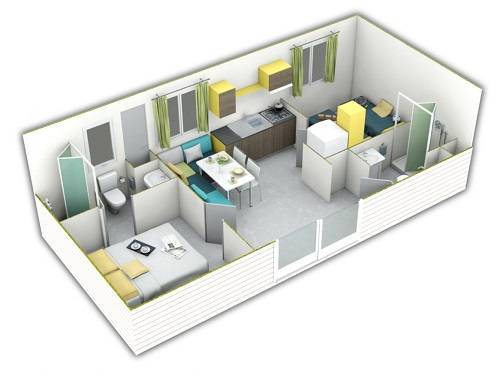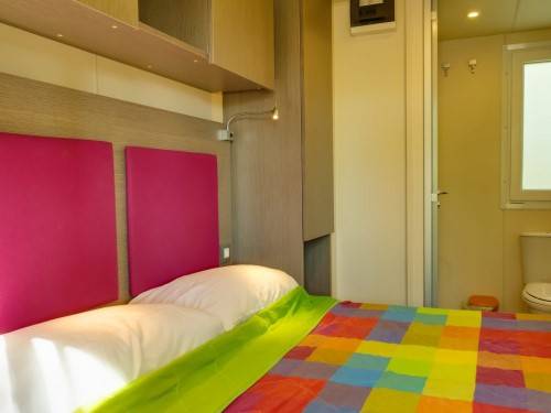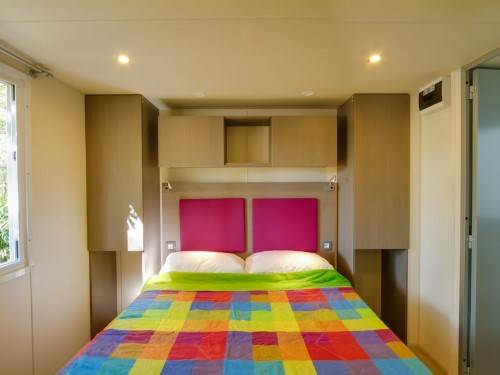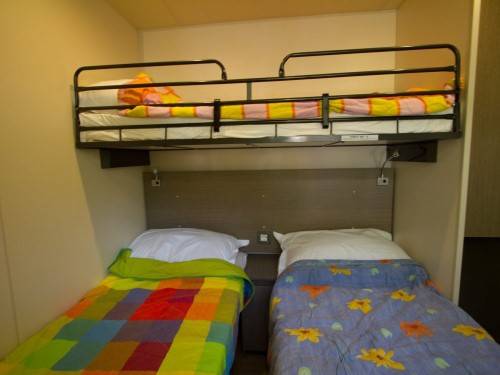 - A 3as mobilhome már kicsit nagyobb mert 32m2, ez is légkondis, 2 fürdős, a franciaágy 150*200cm, a másik szobában gyerekágy 70*190cm, pótágy 64*160cm és dívány egy másfélszemélyes ággyá alakítható, max 5 fős.
