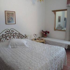 Jelenleg tehát a földszinti apartmant adják ki a nagyobb házban, ez az Aida, itt egy nagy dupla ajtón léphetünk a nappaliba aminek egyik része étkezőként szolgál, oldalt egy lépcsőfokkal feljebb van a nyitott konyha hűtővel. A nappalban van Tv és egy kihúzható fotelágy is ( 1 főre) és innen nyílik a kisebbik hálószoba amiben egy másfeles ágy van. A konyha melletti folyosóról nyílik beljebb a másik hálószoba egy nagy franciággyal, a mellette lévő fürdőszobába a hálóból és a folyosóról is be lehet menni mert 2 ajtaja van. A fürdőben zuhanykbain is van, mosdó, wc és bidet, ablakos.
