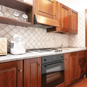 Mangiatoia - a bejárattól egy pár lépcsőfokot lefelé kell mennünk a nappaliba. A tipikus fagerendás belsők mellett most egy újabb felújításon esett át így egy teljesen modern, új konyhát kapott, modern fürdőt. A nagy nappaliban van egy kihúzható dívány is és a szembenlévő falon megmaradt az eredeti istállóból az etetőrész. A konyha teljesen új , van egy nagyobb hűtő mélyhűtő résszel, kenyérpirító és vízforraló és egy sütő de nincsen beépítve- és egy nagy asztal meg vitrin a poharakkal, tányérokkal. Ebben az apartmanban 2 hálószoba van, egy nagyobb franciaágyas meg egy kisebb egyszemélyes ággyal de a nappaliban lévő díványt is ki lehet húzni szükség esetén így akár agy 5 fős család is elférne. A lakásban elég rossz a mobiltelefon vétel vagyis csak bizonyos pontokon csörög ki a telefon (de wifi van) és smart tv is.