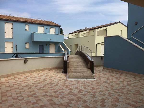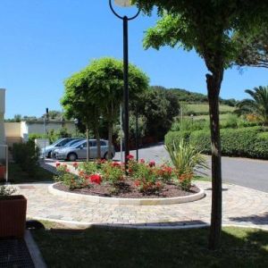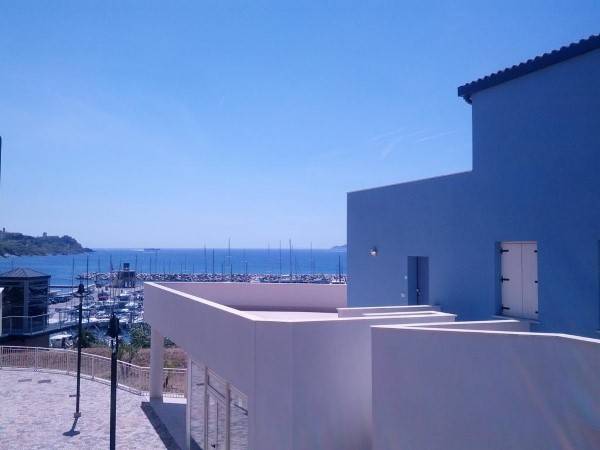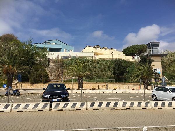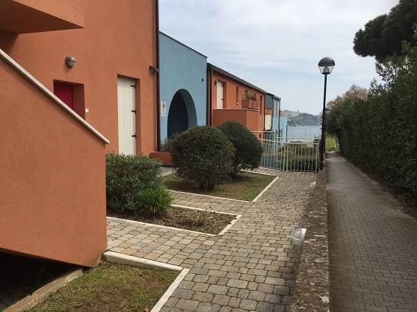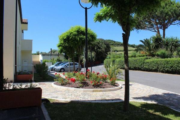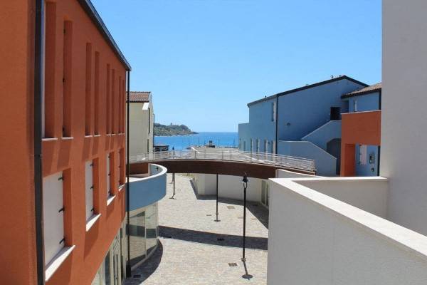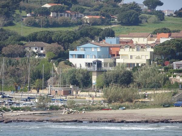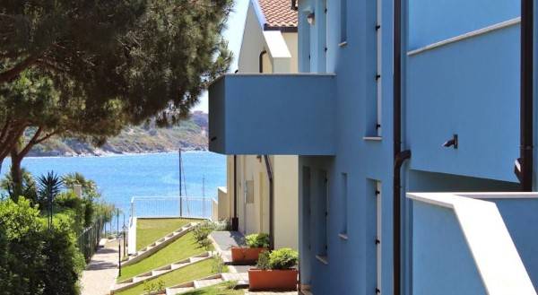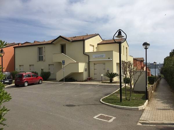 Az épületegyüttes élénk színű falai jól mutatnak a tenger kékje mellett, a lenti kikötőben ringatozó hajók fehér vitorlái és a pálmák, kúszónövények zöldje mellett. Az épület több szintes mert egy lankára épült, U alakú és a középen lévő zárt udvarra is néz sok terasz, ablak. A liftek és lépcsők segítik a partra lejutást ahol van egy étterem is kilátással ami reggel-ebéd és vacsora időben is nyitva van. Az épület alagsorában 2 szinten is zárt parkoló van ahova beállhatnak az apartmanház vendégei. A recepcio minden nap délelött és délután is nyitva van a bejáratnál és itt lehet foglalni motorcsónakot a közeli Baratti öbölbe, bicikliket és erdei lovaglásra is be lehet fizetni. Aki át akar menni Elbára annak foglalnak helyet a kompra kedvezménnyel- pár nappal előre kell szólni. Az apartmanház udvarán lévő helységek nincsenek még kiadva, a wellness részleg sem műküdik de a medence (kicsi de mély) június 1től van nyitva. Alig 50méterre a recepciotól a sarkon áll meg a busz ami 5 perc alatt bevisz Piombino belvárosába de egy parti úton is be lehet gyalogolni hiszen alig 2 km-re van. Az apartmanház mögötti domb tetején 10 perces sétára van egy csillagvizsgáló ahonnan fantasztikus a panoráma is.